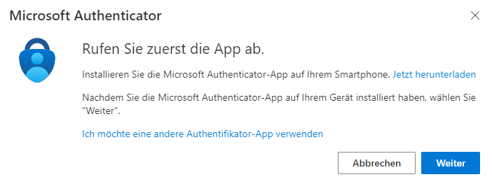 Wählen Sie weiter aus und wählen Sie auf dem nachfolgenden Bild „Ich möchte eine andere Authenticator-App verwenden“